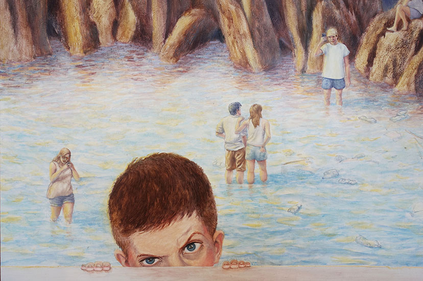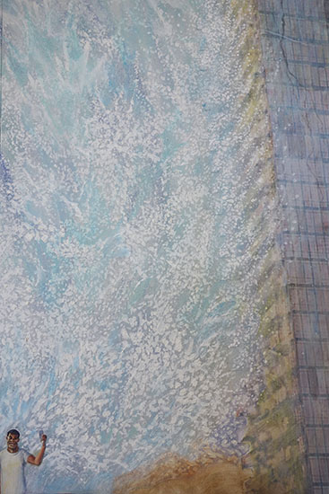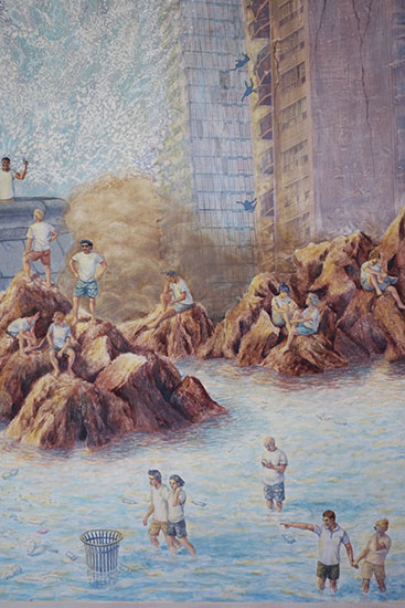 When you first look at this painting, you think, “Oh, what a lovely scene!” But on a second look, you notice that that is a REALLY big wave, and wait - those buildings are cracking and falling down! And there are people falling from them! And those people walking in the front are wading through floodwater and garbage. Yet everyone is either oblivious or blasé about all these extreme conditions which result from climate chaos. So it is only natural that the young boy, who embodies future generations, clinging by his fingertips, asks, “REALLY?”